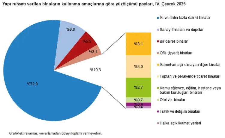 Bir önceki yılın aynı çeyreğine göre, 2025'in son çeyreğinde yapı ruhsatı verilen bina sayısı yüzde 5,5, daire sayısı yüzde 13,8, toplam yüzölçüm yüzde 2,6 arttı.