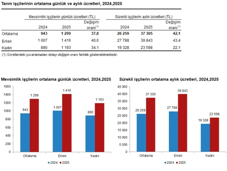 Tarımsal işletmelerde 2025 yılında mevsimlik tarım işçilerinin günlük ücretleri bir önceki yıla göre yüzde 37,8 artarak 1 299 TL, sürekli tarım işçilerinin aylık ücretleri ise yüzde 42,1 artarak 37 bin 305 TL oldu.
