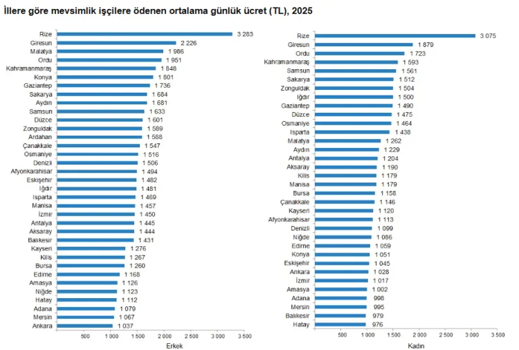 Tarımsal işletmelerde 2025 yılında mevsimlik tarım işçilerine yapılan en yüksek günlük ücret ödemesi erkek işçiler için 3 bin 283 TL, kadın işçiler için 3 bin 75 TL ile Rize ilinde gerçekleşti. En düşük ücret ödemesi ise erkek işçiler için 1 037 TL ile Ankara, kadın işçiler için ise 976 TL ile Hatay ilinde gerçekleşti.