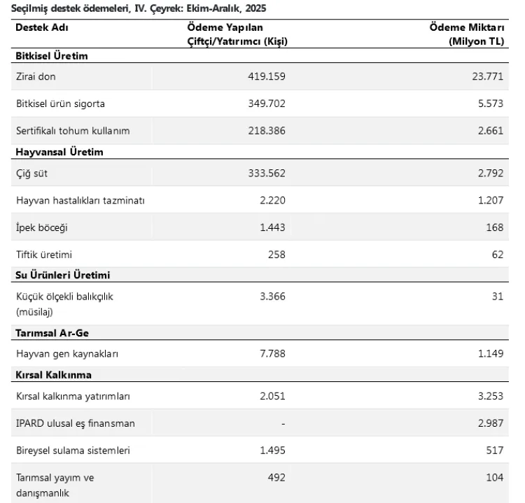 ANKARA (İGFA) - 2025 yılı tarımsal destek ödemeleri "IV. Çeyrek ve Yıllık: Ekim-Aralık" verileriyle netleşti.