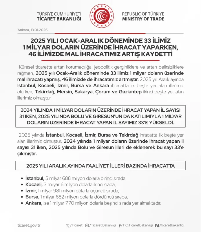 Ticaret Bakanlığı, 2025 yılı Ocak-Aralık dönemine ilişkin il bazlı ihracat verilerini açıkladı. Bakanlıktan yapılan açıklamaya göre, geçen yıl 33 ilimiz 1 milyar doların üzerinde ihracat gerçekleştirirken, 46 ilimizde mal ihracatı artış gösterdi.