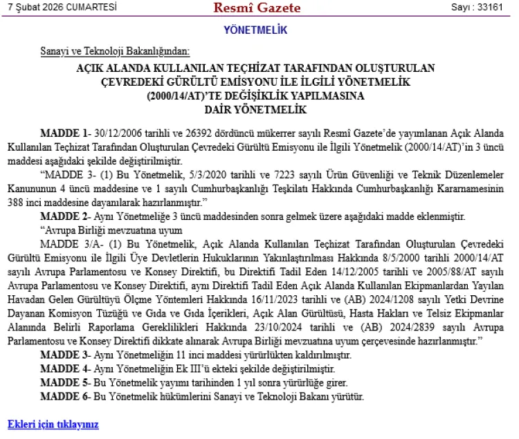 Sanayi ve Teknoloji Bakanlığı, "Açık Alanda Kullanılan Teçhizat Tarafından Oluşturulan Çevredeki Gürültü Emisyonu ile İlgili Yönetmelik"te AB mevzuatına uyum ve bazı maddelerde değişiklikler yaptı.