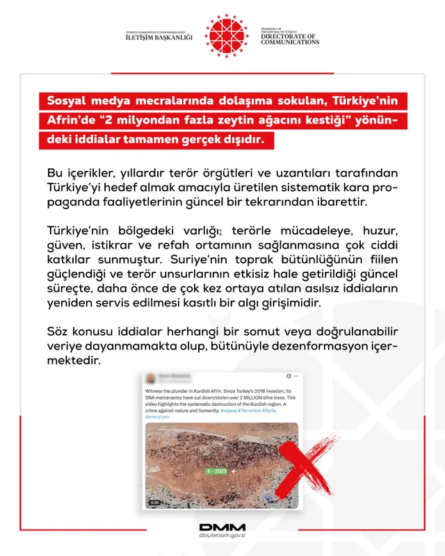 İletişim Başkanlığı Dezenformasyonla Mücadele Merkezi, Türkiye'nin Afrin'de 2 milyondan fazla zeytin ağacını kestiği yönündeki iddiaların tamamen asılsız ve kara propaganda ürünü olduğunu açıkladı.