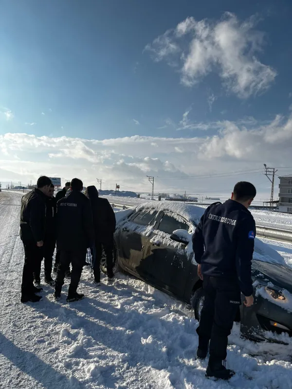 AĞRI (İGFA) - Ağrı'nın Patnos ilçesinde görev yapan infaz ve koruma memurları, gece nöbeti sonrası evlerine dönerken yolda kayarak mahsur kalan bir aracı fark etti.