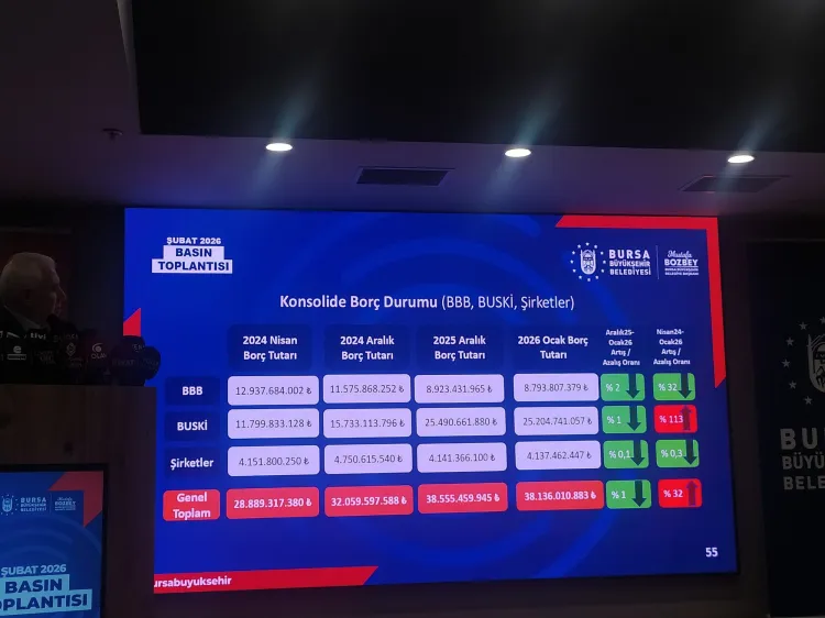 Bursa Büyükşehir Belediyesi'nin borçlarında son bir ayda yüzde 2, Nisan 2024'ten bu yana ise yüzde 32'lik düşüş sağlandığını kaydeden Başkan Bozbey, bağlı şirketlerde de benzer bir tablo olduğunu söyledi. Ancak BUSKİ'de, Aralık 2025–Ocak 2026 arasında borçlarda binde 1 civarında değişim görüldüğünü, göreve geldiklerinden bugüne kadar ise yüzde 113 oranında artış olduğunu ifade etti.
