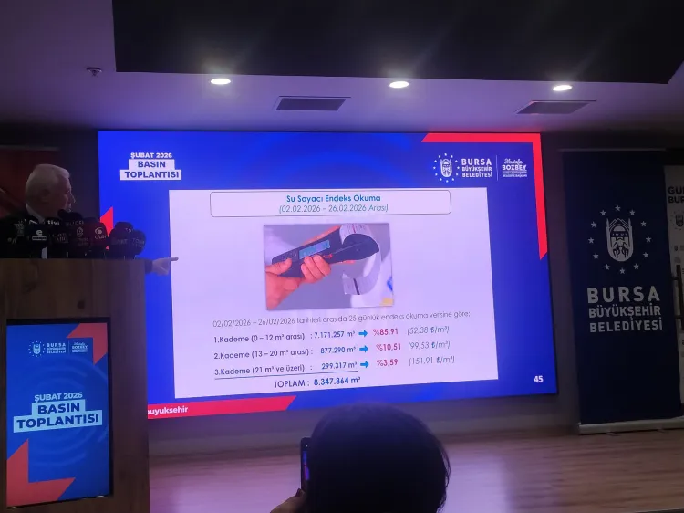 Bursa'daki baraj doluluk oranlarına da dikkati çeken Başkan Bozbey; Doğancı Barajı'nde yüzde 56, Nilüfer Barajı'nda yüzde 78,52, Çınarcık Barajı'nda yüzde 79,23, Ortalama doluluk oranının ise yüzde 67,3 olduğunu duyurdu. Bozbey, 2024 Şubat sonu doluluk oranının yüzde 92 iken 2025'te yüzde 35, 2026'da ise yüzde 66 seviyesinde olduğunu anımsatarak, vatandaşları su tasarrufuna çağırdı.