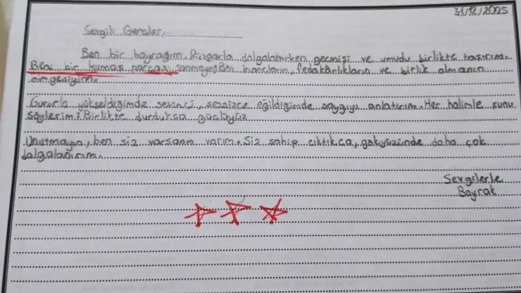 Etkinlikler çerçevesinde Türkçe öğretmeni tarafından öğrencilere "Bayrağın öğrenciye seslenişi" konulu bir paragraf yazma çalışması da yaptırıldı. Çalışma kapsamında 6/D sınıfı öğrencisi Sena Selen tarafından kaleme alınan paragraf, içerdiği duygu ve anlatımıyla dikkat çekti.