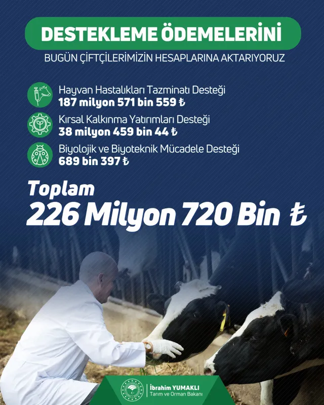 Tarım ve Orman Bakanı İbrahim Yumaklı, 226 milyon TL'lik tarımsal destek ödemelerinin bugün çiftçilerin hesaplarına aktarıldığını duyurdu.