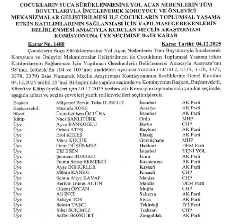 Türkiye Büyük Millet Meclisi'nin aldığı kararla oluşturulan komisyon, çocuk suçluluğuna neden olan sosyal, ekonomik ve psikolojik etkenleri araştırarak çözüm önerileri geliştirecek. Resmi Gazete'de yayımlanan karar ile komisyonun görev alacak milletvekili üyeleri resmen belirlenmiş oldu.