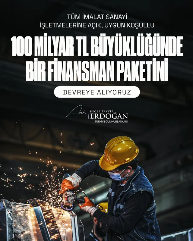 Cumhurbaşkanı Erdoğan, imalat sanayi işletmelerine yönelik yeni bir destek paketini de kamuoyuyla paylaştı. Tüm imalat sanayi işletmelerine açık, 100 milyar lira büyüklüğünde uygun koşullu bir finansman paketinin devreye alındığını belirten Erdoğan, paketin 6 ay anapara ödemesiz ve 36 aya kadar vadeli olacağını söyledi.