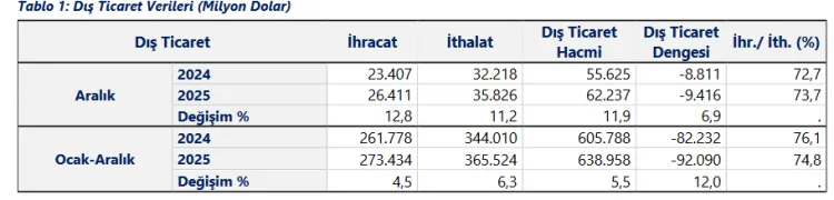 Ocak-Aralık 2025 döneminde ise ihracat yüzde 4,5 artışla 273,4 milyar dolar, ithalat yüzde 6,3 artışla 365,5 milyar dolar olurken, toplam dış ticaret hacmi yüzde 5,5 artışla 638,9 milyar dolar olarak kayıtlara geçti.