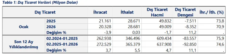Ticaret Bakanlığı'nın açıkladığı Ocak 2026 dış ticaret verilerine göre ihracat yıllık bazda yüzde 3,9 azalırken, ithalat yüzde 0,03 artış gösterdi. İhracatın ithalatı karşılama oranı yüzde 70,9'a geriledi.