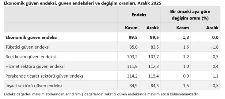 TÜİK'in açıkladığı yılın son ayına ilişkin Ekonomik Güven Endeksi, Aralık'ta aynı düzeyde kalarak 99,5 değerini aldı.