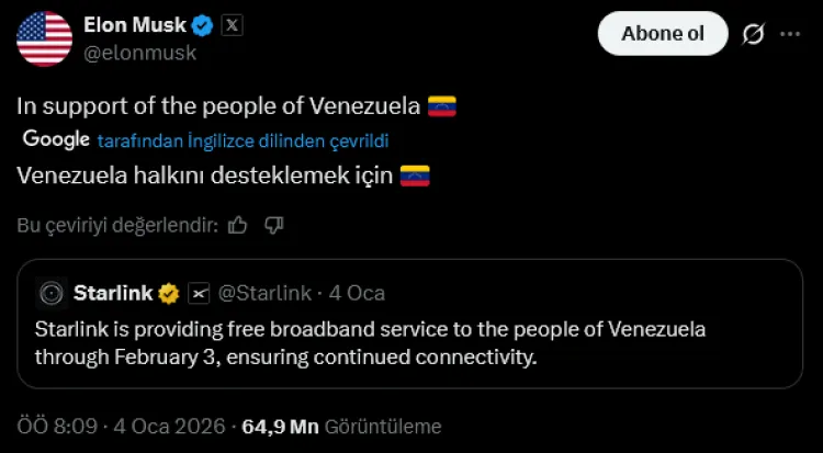 Elon Musk, Venezuela'da yaşanan gelişmeler sonrası ABD'nin operasyonuna destek verdiğini açıklayarak, ülkede bir ay boyunca Starlink üzerinden ücretsiz internet hizmeti sunulacağını duyurdu.