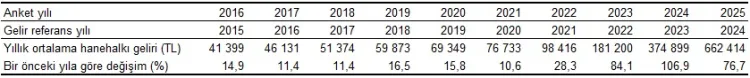 Türkiye genelinde yıllık ortalama hanehalkı kullanılabilir geliri, bir önceki yıla göre yüzde 76,7 artarak 662 bin 414 TL oldu. Yıllık ortalama eşdeğer hanehalkı kullanılabilir fert geliri ise yüzde 77,3 artışla 332 bin 882 TL'ye yükseldi.