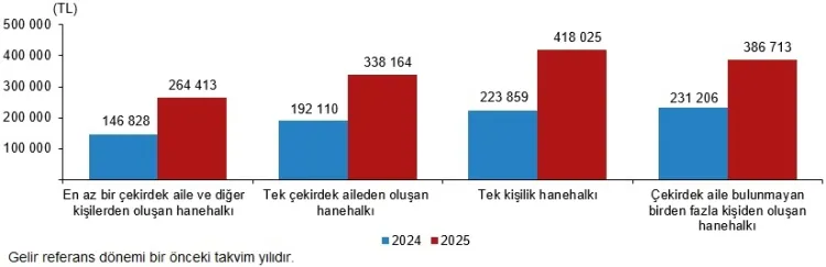 En yüksek ortalama gelir, 418 bin 25 TL ile tek kişilik hanehalklarında görülürken, en düşük gelir 264 bin 413 TL ile en az bir çekirdek aile ve diğer kişilerden oluşan hanehalklarında kaydedildi.
