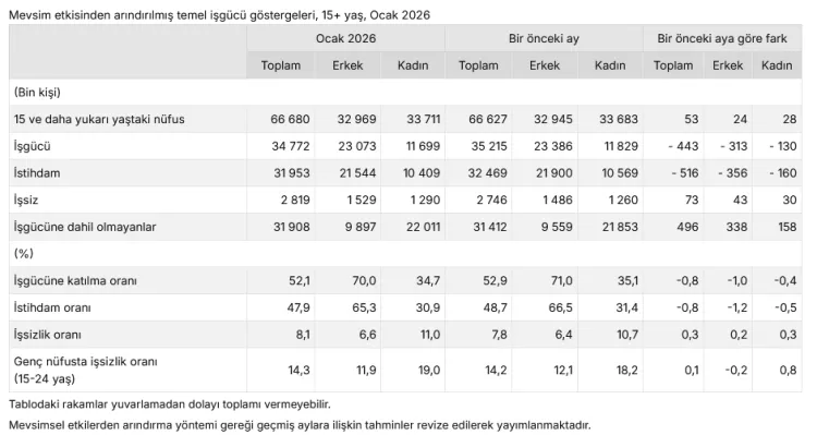 Ocak ayında istihdam edilenlerin sayısı 516 bin kişi azalarak 31 milyon 953 bin kişi oldu; istihdam oranı da 0,8 puan düşerek yüzde 47,9 seviyesine geriledi. Erkeklerde istihdam oranı yüzde 65,3, kadınlarda ise yüzde 30,9 olarak gerçekleşti. Mevsim etkisinden arındırılmış işgücüne katılma oranı ise 0,8 puan azalarak yüzde 52,1 seviyesinde kaydedildi. Toplam işgücü Ocak ayında bir önceki aya göre 443 bin kişi azalarak 34 milyon 772 bin kişi oldu. İşgücüne katılma oranı erkeklerde yüzde 70,0, kadınlarda yüzde 34,7 olarak gerçekleşti.