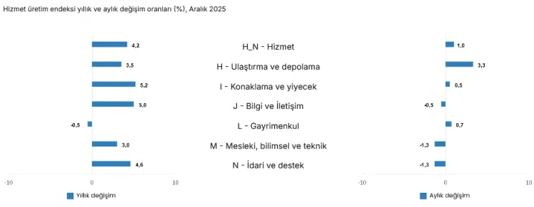 TÜİK verilerine göre, 2025 yılı Aralık ayında hizmet üretim endeksi yıllık yüzde 4,2 artarken, aylık bazda yüzde 1,0 yükseldi. Veriler, özellikle konaklama ve yiyecek sektörünün yıllık bazda güçlü bir büyüme sergilediğini, ulaştırma ve depolama hizmetlerinin ise hem yıllık hem de aylık bazda artış trendi gösterdiğini ortaya koydu.