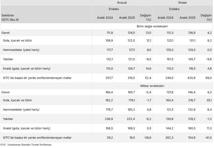 TÜİK'in açıkladığı 2025 Aralık ayı dış ticaret endekslerine göre ihracat birim değer endeksi yıllık bazda yüzde 13 artarken, ihracat miktarı yüzde 0,4 azaldı. İthalat tarafında ise birim değer yüzde 4,2, miktar endeksi yüzde 6,3 yükseldi.