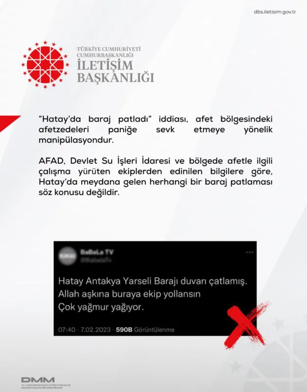 ANKARA (İGFA) - İletişim Başkanlığı, 6 Şubat 2023'te Kahramanmaraş merkezli depremler sonrası dijital mecralarda hızla yayılan yalan ve yanıltıcı bilgilerin toplumsal dayanıklılığı zayıflattığını açıkladı.