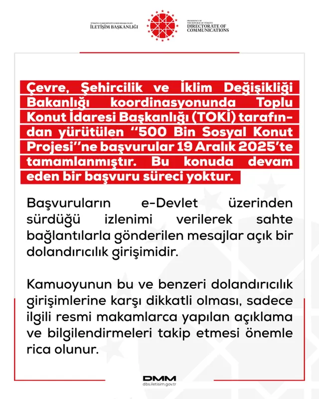 Çevre, Şehircilik ve İklim Değişikliği Bakanlığı koordinasyonunda yürütülen "500 Bin Sosyal Konut Projesi" başvurularının 19 Aralık 2025'te sona erdiği bildirildi. İletişim Başkanlığı, sahte bağlantılarla gönderilen mesajlara karşı vatandaşları uyardı.