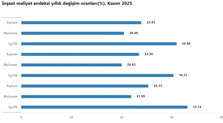 Türkiye İstatistik Kurumu (TÜİK), 2025 yılı Kasım ayına ilişkin İnşaat Maliyet Endeksi verilerini açıkladı. Buna göre inşaat maliyetleri aylık yüzde 1,14, yıllık yüzde 23,93 oranında arttı.