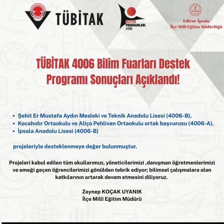 TÜBİTAK 4006 Bilim Fuarları Destek Programı sonuçlarına göre Edirne genelinde kabul edilen 13 projeden 3'ü İpsala'daki okullara ait oldu. İlçe, bilimsel projelerdeki başarısıyla öne çıktı.