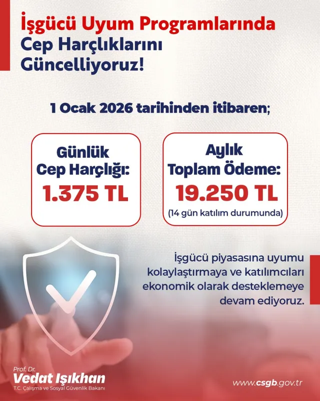 Bakan Işıkhan'ın açıklamasına göre, 1 Ocak 2026 itibarıyla günlük cep harçlığı bin 375 TL'ye yükselirken, 14 gün programa katılım gösteren katılımcılar aylık toplam 19 bin 250 TL ödeme alacak. Bakan Işıkhan, "İşgücü Uyum Programımız ile vatandaşlarımızın iş hayatına geçişini desteklemeye ve ekonomik güçlerini artırmaya devam ediyoruz" ifadelerini kullandı.