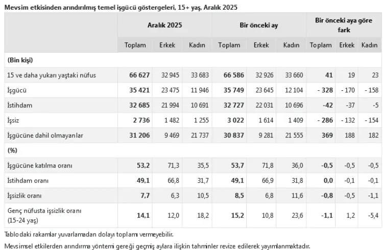 Aralık ayında istihdam edilenlerin sayısı bir önceki aya göre 42 bin kişi azalarak 32 milyon 685 bin kişi oldu. Mevsim etkisinden arındırılmış istihdam oranı ise yüzde 49,1 seviyesinde sabit kaldı. Bu oran erkeklerde yüzde 66,8, kadınlarda ise yüzde 31,7 olarak gerçekleşti.