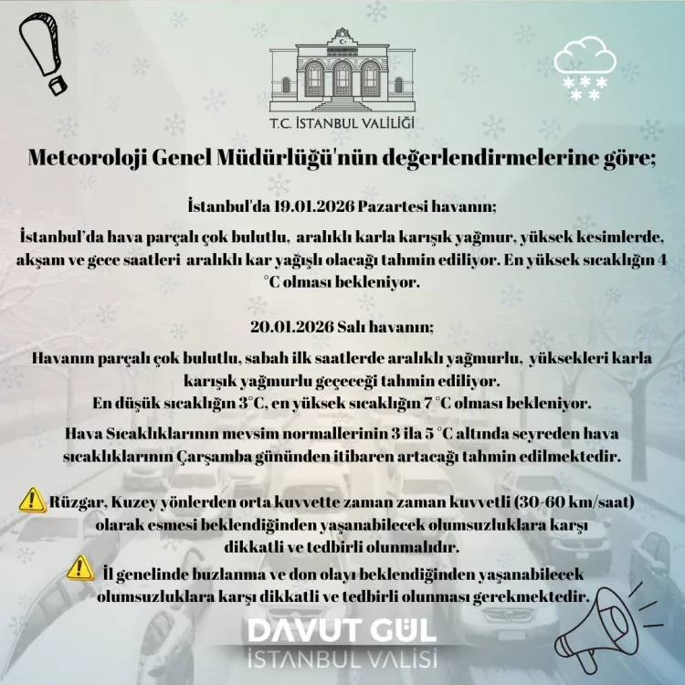 İstanbul Valiliği, Meteoroloji Genel Müdürlüğü verilerine dayanarak karla karışık yağmur, kuvvetli rüzgâr, buzlanma ve don olaylarına karşı vatandaşları uyardı.