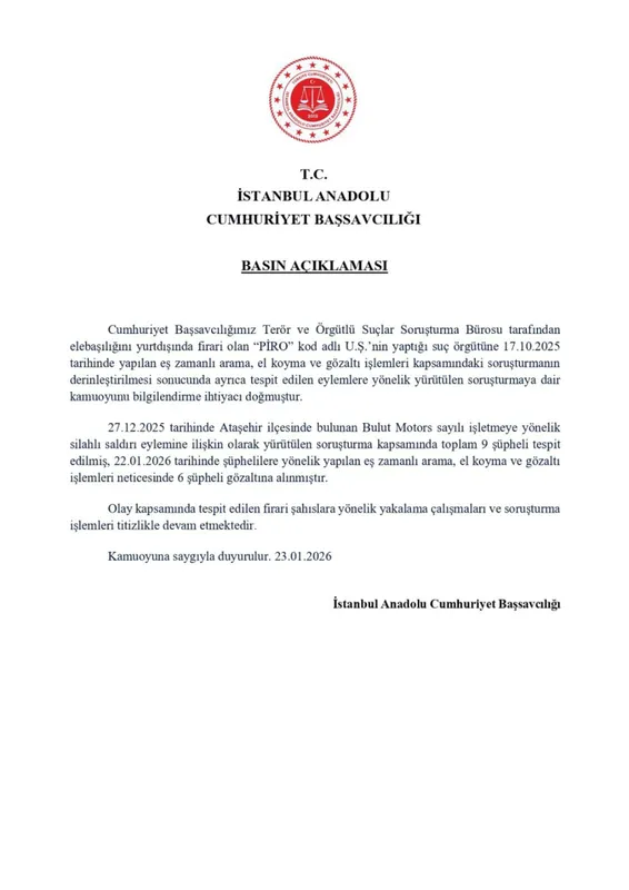 Başsavcılık tarafından yapılan açıklamada, örgüte yönelik 17 Ekim 2025 tarihinde gerçekleştirilen eş zamanlı arama, el koyma ve gözaltı işlemlerinin ardından tespit edilen yeni eylemler doğrultusunda soruşturmanın derinleştirildiği belirtildi. Bu kapsamda, 27 Aralık 2025 tarihinde Ataşehir ilçesinde Bulut Motors isimli iş yerine yönelik düzenlenen silahlı saldırı olayıyla bağlantılı olarak toplam 9 şüpheli tespit edildi. Şüphelilere yönelik 22 Ocak 2026 tarihinde düzenlenen eş zamanlı operasyonlarda 6 kişi gözaltına alındı.