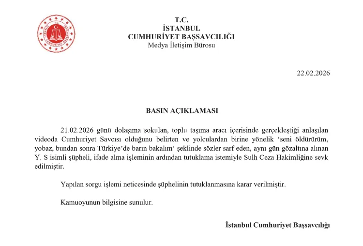 İSTANBUL (İGFA)- İstanbul Cumhuriyet Başsavcılığı, toplu taşıma aracında yolculara yönelik tehditler savuran bir kişi hakkında açıklama yaptı.