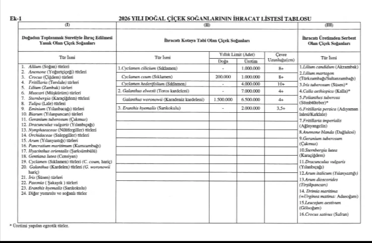ANKARA (İGFA) - Tarım ve Orman Bakanlığı tarafından hazırlanan "Doğal Çiçek Soğanlarının 2026 Yılı İhracat Listesi Hakkında Tebliğ" Resmi Gazete'de yayımlanarak duyuruldu. Tebliğ, doğadan toplanması yasak olan türleri, kota uygulanacak türleri ve ihracatı üretimden serbest olan türleri belirleyerek, ihracat süreçlerine dair düzenlemeler içeriyor.