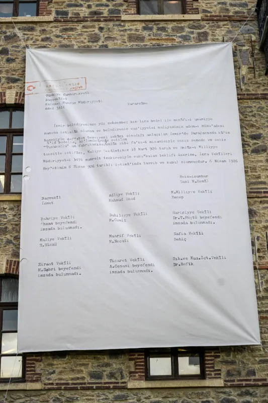 İZMİR (İGFA) - Meslek Fabrikası olarak hizmet veren binanın 1926 yılında Gazi Mustafa Kemal Atatürk'ün imzaladığı kararnameyle İzmir Büyükşehir Belediyesi mülkiyetine geçtiğini gösteren resmi belgelere ait görseller tarihi yapının duvarlarına asıldı.