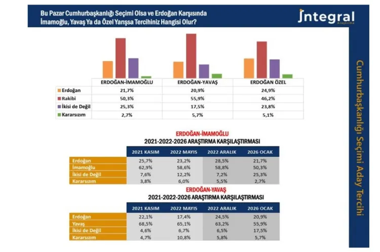 İntegral Araştırma son 4 yıl boyunca yaptığı araştırmalarla karşılaştırıldığında Erdoğan ile CHP'nin olası adayları senaryoları için en kritik bulgunun "İkisi de değil, Kararsızım" seçeneklerindeki artış olduğunu açıkladı. Bu artışın hem iktidar hem muhalefet cephesindeki yorgunluk kadar seçmenin yeni yol, yeni aday arayışı ve de özellikle İstanbul merkezli yürütülen soruşturmalarla açıklanabileceği vurgulandı.