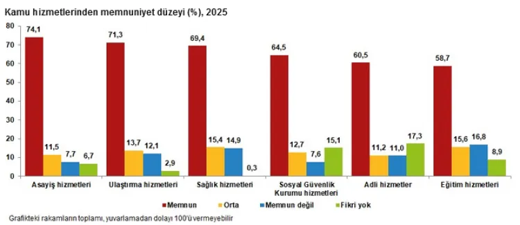 2025 yılında asayiş hizmetlerinden memnuniyet yüzde 74,1 ile en yüksek seviyeye ulaştı. Bunu sırasıyla ulaştırma (yüzde 71,3), sağlık (yüzde 69,4), Sosyal Güvenlik Kurumu (yüzde 64,5), adli hizmetler (yüzde 60,5) ve eğitim (yüzde 58,7) takip etti.