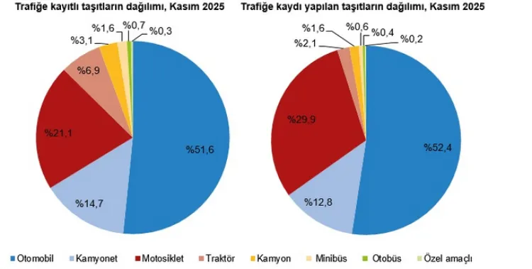 Kasım ayında trafiğe kaydı yapılan taşıtların dağılımı şöyle gerçekleşti: yüzde 52,4 otomobil, yüzde 29,9 motosiklet, yüzde 12,8 kamyonet, yüzde 2,1 traktör, yüzde 1,6 kamyon, yüzde 0,6 minibüs, yüzde 0,4 otobüs ve yüzde 0,2 özel amaçlı taşıtlar. Özellikle otomobil, kamyonet ve özel amaçlı taşıtlarda artış görülürken, motosiklet, kamyon ve minibüste düşüş kaydedildi.