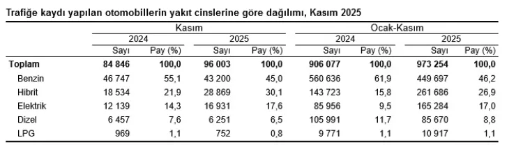 Ocak-Kasım döneminde trafiğe kaydı yapılan otomobillerin yakıt türü dağılımı ise şöyle oldu: