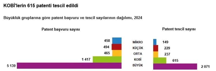TÜİK verilerine göre, Türkiye'de KOBİ'ler toplam girişimlerin yüzde 99,6'sını oluştururken istihdamın ve ihracatın önemli bir kısmına katkı sağladı. 2024 yılında bin 417 patent başvurusunda bulunan KOBİ'lerin 615 patenti tescil edildi.