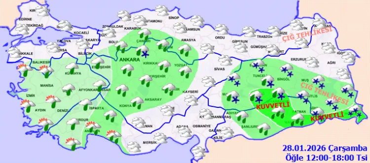 ANKARA (İGFA) - Marmara, Ege, Akdeniz, İç Anadolu ve Güneydoğu Anadolu ile Batı Karadeniz'in batı, Doğu Anadolu'nun güney ve batı kesimlerinin yağışlı geçeceği, genellikle yağmur ve sağanak, yurdun doğu kesimlerinde karla karışık yağmur ve kar şeklinde görülecek yağışların, Ege ve Akdeniz kıyıları, Güneydoğu Anadolu ve Doğu Anadolu'nun güney ve batısında yer yer kuvvetli olacağı tahmin ediliyor. Doğu Karadeniz'in iç kesimlerinin yüksekleri ile Doğu Anadolu'nun doğusunun yüksek kar örtüsüne sahip eğimli kesimlerinde çığ tehlikesi bulunmaktadır.