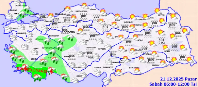 Buna göre, Marmara'nın doğusu, Batı Akdeniz, Tekirdağ, İzmir, Aydın, Muğla, Afyonkarahisar, Kütahya, Zonguldak, Bolu, Düzce, Erzincan, Tunceli çevreleri, Kırklareli'nin kıyı kesimleri, Ankara ve Eskişehir'in güneyi, Konya'nın kuzey ve batısı ile Erzurum'un batısının yağmur ve sağanak yağışlı, Güney Ege kıyıları ile Batı Akdeniz kıyılarının gök gürültülü sağanak yağışlı geçeceği tahmin ediliyor. Yağışların; Muğla ve Antalya çevrelerinde yerel kuvvetli olması bekleniyor. Sabah ve gece saatlerinde iç ve doğu bölgelerde pus ve yer yer sis bekleniyor.