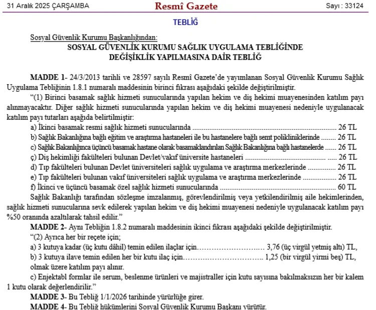 Bugünkü Resmi Gazete'de yayımlanan tebliğle, hekim muayenesi ve reçete katılım paylarında düzenlemeye gidildi. Yeni uygulama 1 Ocak 2026'da yürürlüğe girecek.