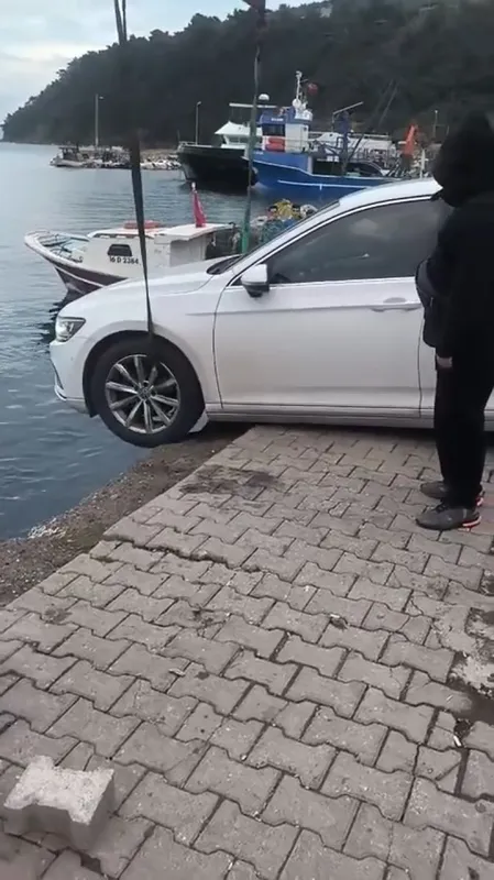 49 plakalı bir otomobil, liman içerisinde dönüş yaptığı sırada ön iki tekerleğinin boşluğa gelmesiyle denize düşme tehlikesi atlattı.