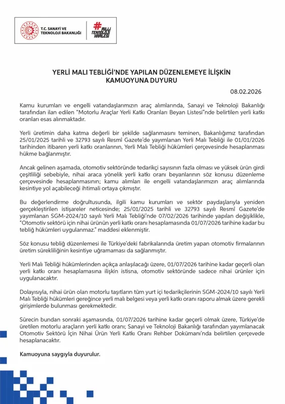 Bu kapsamda, kamu kurumları ve sektör paydaşlarıyla yapılan istişareler sonucunda, SGM-2024/10 sayılı Yerli Malı Tebliği'nde 7 Şubat 2026 tarihinde değişikliğe gidildi. Yapılan düzenleme ile otomotiv sektöründe nihai ürünler için yerli katkı oranı hesaplamasında tebliğ hükümlerinin 1 Temmuz 2026'ya kadar uygulanmaması hüküm altına alındı.