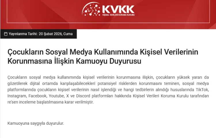 Kişisel Verileri Koruma Kurulu, çocukların kişisel verilerinin korunması amacıyla TikTok, Instagram, Facebook, YouTube, X ve Discord hakkında re'sen inceleme başlattı.