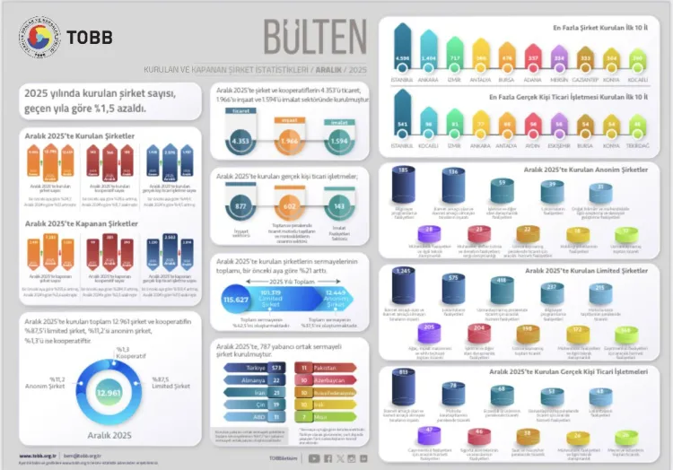 Aralık 2025 özelinde ise kurulan şirket sayısı, Aralık 2024'e göre yüzde 1,1, kurulan gerçek kişi ticari işletme sayısı yüzde 4,5 artış gösterdi. Aralık ayında kurulan kooperatif sayısı ise yüzde 11,7 azaldı. Bir önceki aya göre ise kurulan şirket sayısında yüzde 34,7, kurulan gerçek kişi ticari işletme sayısında yüzde 44,4, kurulan kooperatif sayısında yüzde 18,6 oranında artış yaşandı. Kapanan işyerlerinde ise şirketler yüzde 193,6, kooperatifler yüzde 284,9 ve gerçek kişi ticari işletmeler yüzde 103,4 oranında artış gösterdi.