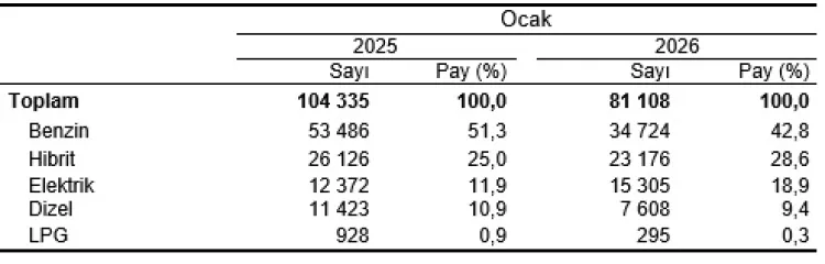 Yeni kaydedilen otomobillerin yüzde 42,8'i benzinli, yüzde 28,6'sı hibrit ve yüzde 18,9'u elektrikli oldu. Dizel otomobillerin payı yüzde 9,4'te kaldı. Mevcut otomobil parkında ise dizel (yüzde 32,5), benzin (yüzde 31) ve LPG'li (yüzde 30) araçlar ağırlığını koruyor; elektrikli otomobillerin toplam payı yüzde 2,2 seviyesinde bulunuyor.