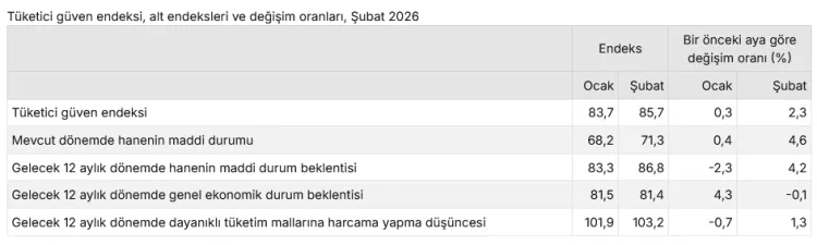TÜİK ve Merkez Bankası işbirliğiyle yürütülen anket sonuçlarına göre, tüketici güven endeksi Şubat ayında 85,7'ye yükseldi.