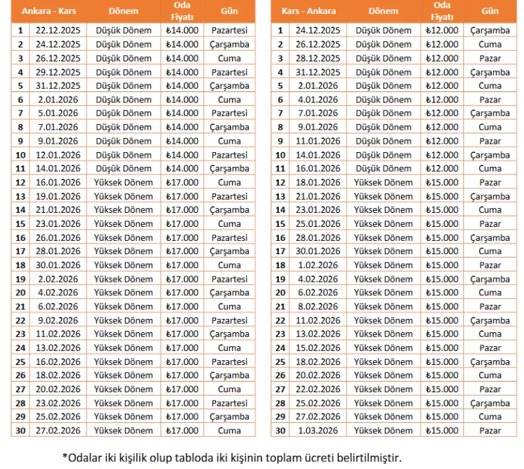8 Yataklı Vagon + 1 Yemekli Vagon ile her yataklı vagonda 10 kompartımanda 2'şer adet tek kişilik yataktan toplam 160 kişi yolcu kapasiteli trenlerin sefer günleri ve oda ücret tarifesi şöyle: