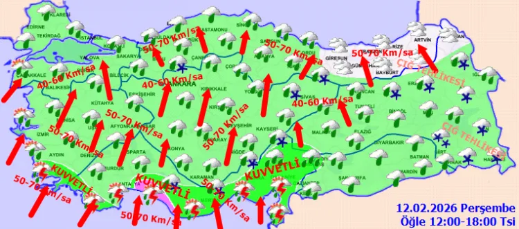 ANKARA (İGFA) - Meteoroloji Genel Müdürlüğü, 12 Şubat Perşembe gününe ilişkin hava tahmin raporunu yayımladı.